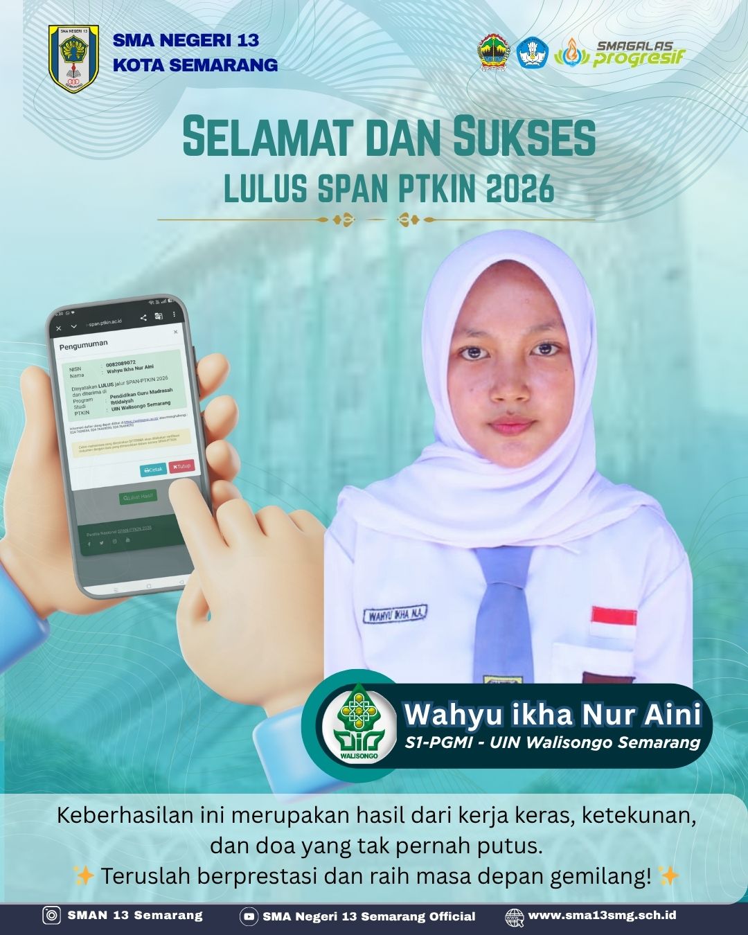 Keluarga besar SMA Negeri 13 Semarang dengan bangga mengucapkan selamat kepada seluruh siswa kelas XII yang telah berhasil lolos dalam Seleksi Nasional Berdasarkan Prestasi (SNBP) dan Seleksi Prestasi Akademik Nasional Perguruan Tinggi Keagamaan Islam Negeri (SPAN PTKIN) Tahun 2026.